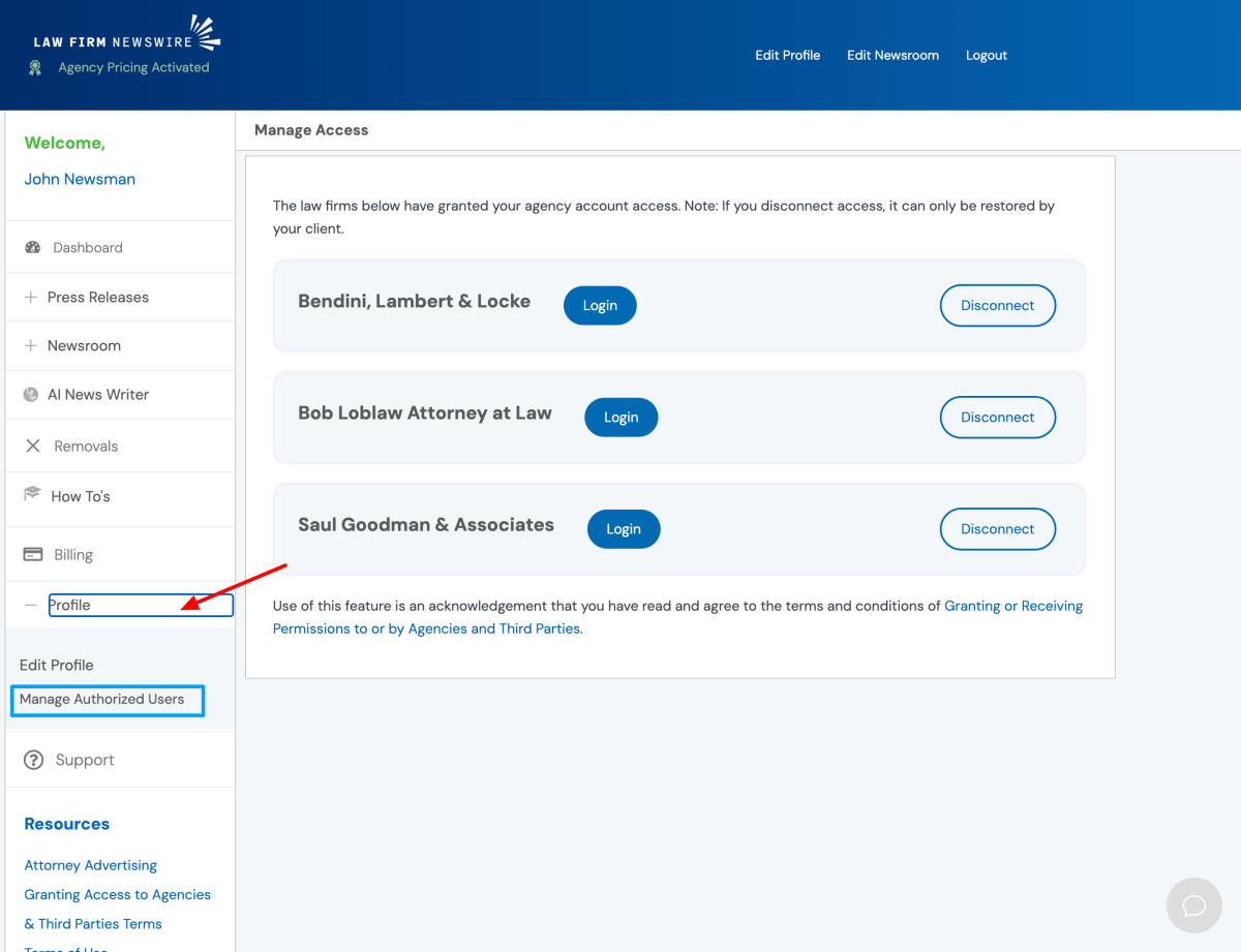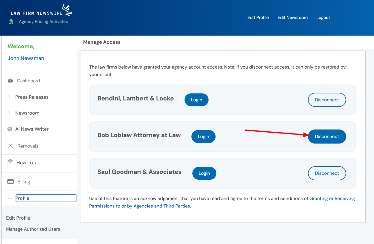 Sometimes you have to part ways with your client. Law Firm Newswire allows users to add or remove agencies from their accounts. However, Agencies can also disconnect a user.