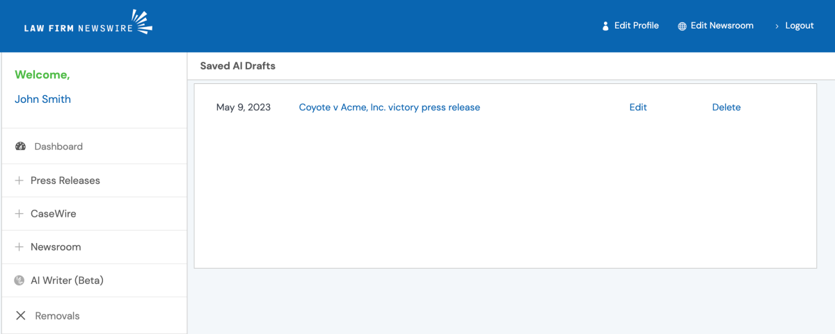 LFN’s AI writer is trained to write legal press releases. You can use the AI writer to produce basic press releases as well as more complicated press releases relating to court rulings, settlement agreements, and complex inputs. You can also modify the outputs to make it perfect.