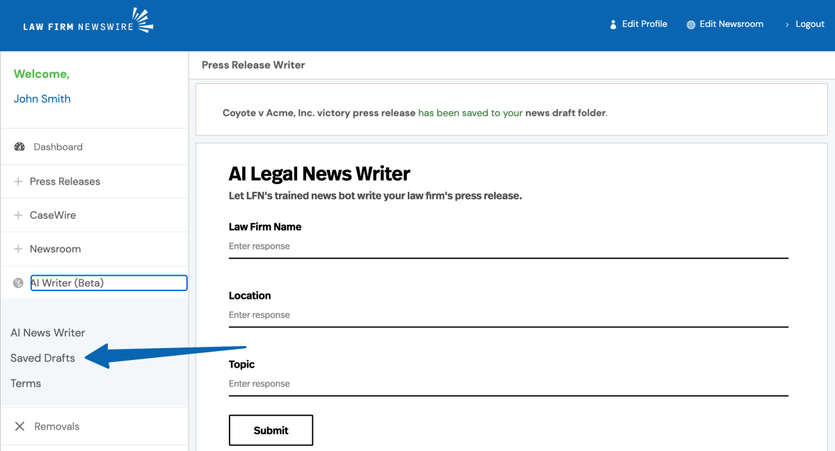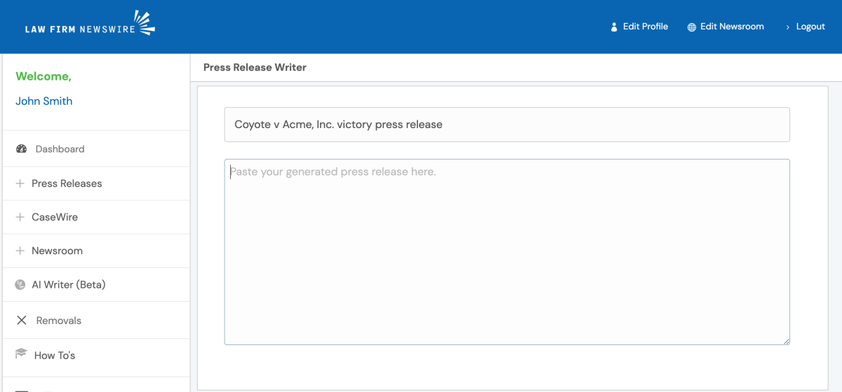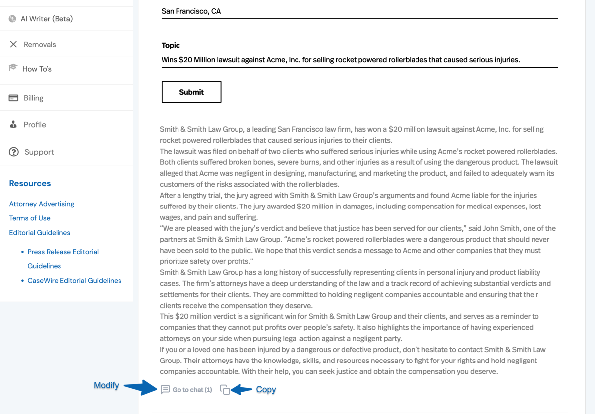 Type in your law firm’s name, location, and a topic. For our first example, we will use a basic input where we ask for a press release based on winning a lawsuit against Acme, Inc. You will just need to input 1-2 sentences of details.