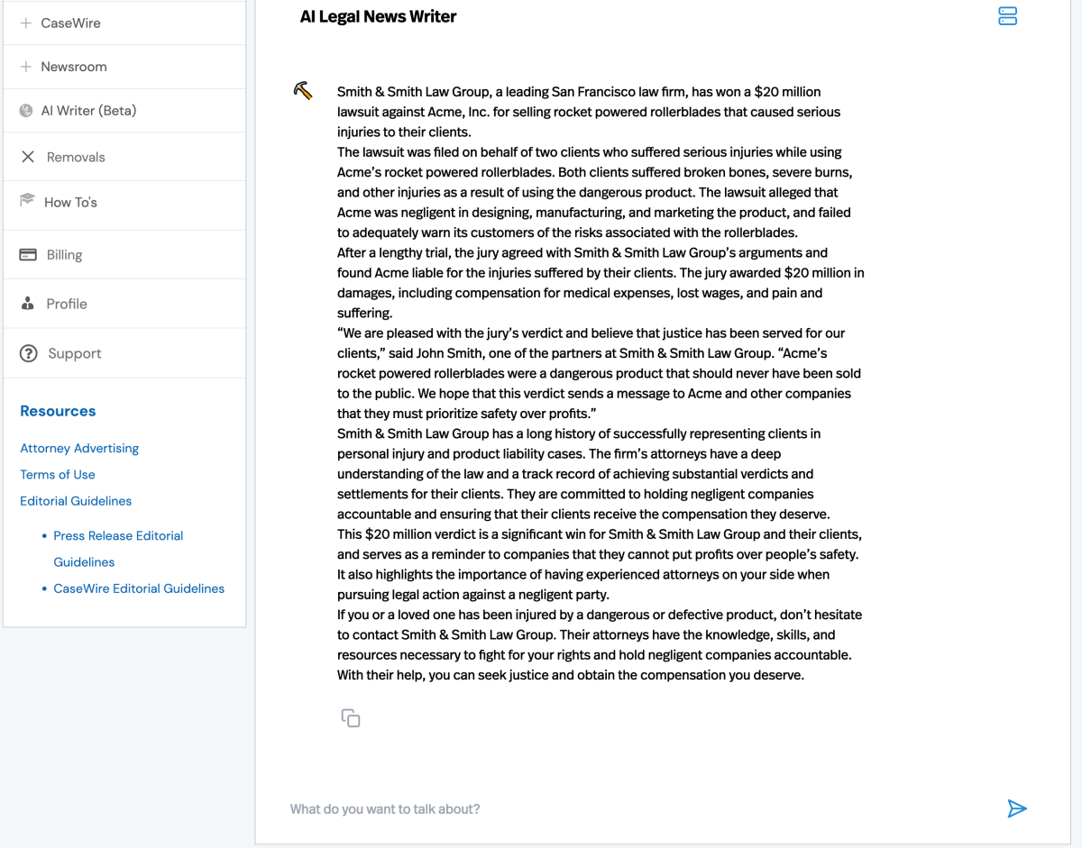 - Change the title to something that is more compelling – This prompt resulted in this new title, “Smith & Smith Law Group wins $20 Million lawsuit against Acme, Inc. for selling rocket-powered rollerblades that caused serious injuries: A Wake-Up Call for Companies to Prioritize Safety Over Profits.”