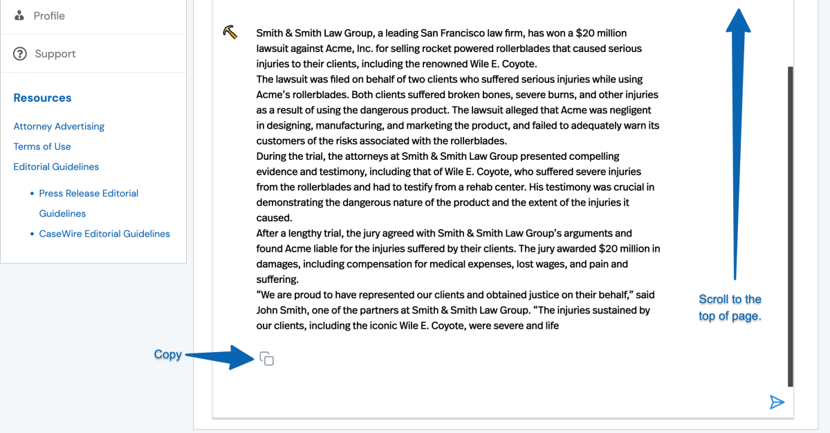 - Rewrite the press release to include… – In this example, you can have the release rewritten to include new details. This could be a new quote or something that you feel is interesting. We asked the bot to “Rewrite the press release to include that the victory was due in part to the compelling testimony of Wile E. Coyote, whose injuries were so severe he had to testify from a rehab center.”